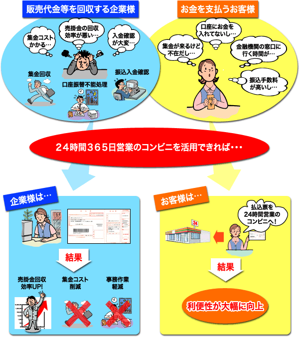 しんきんコンビニ収納サービスは、貴社の販売代金等を全国のコンビニ店舗でお客さまから料金回収を行い、回収した資金の入金および料金収納情報を貴社へご提供するサービスです。