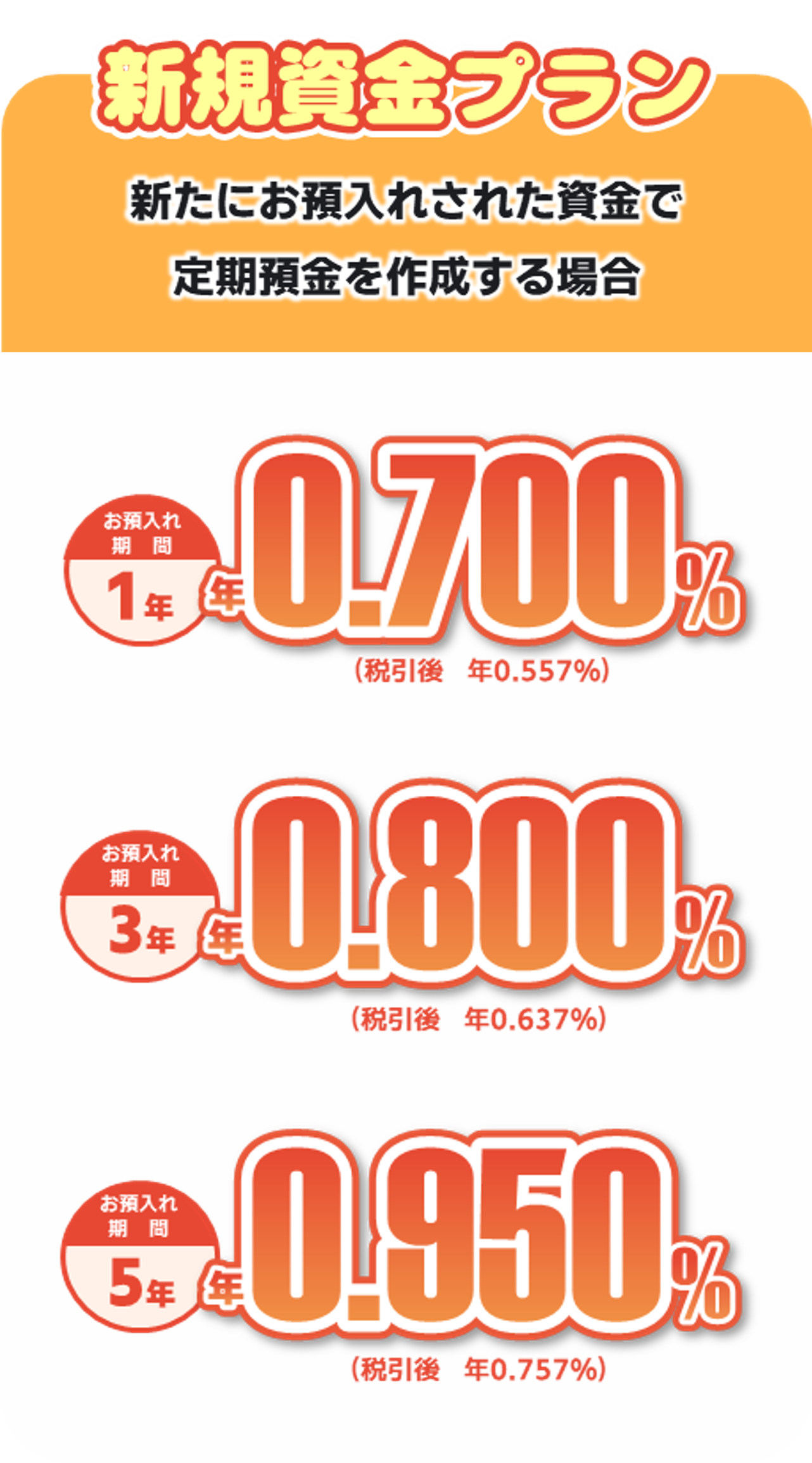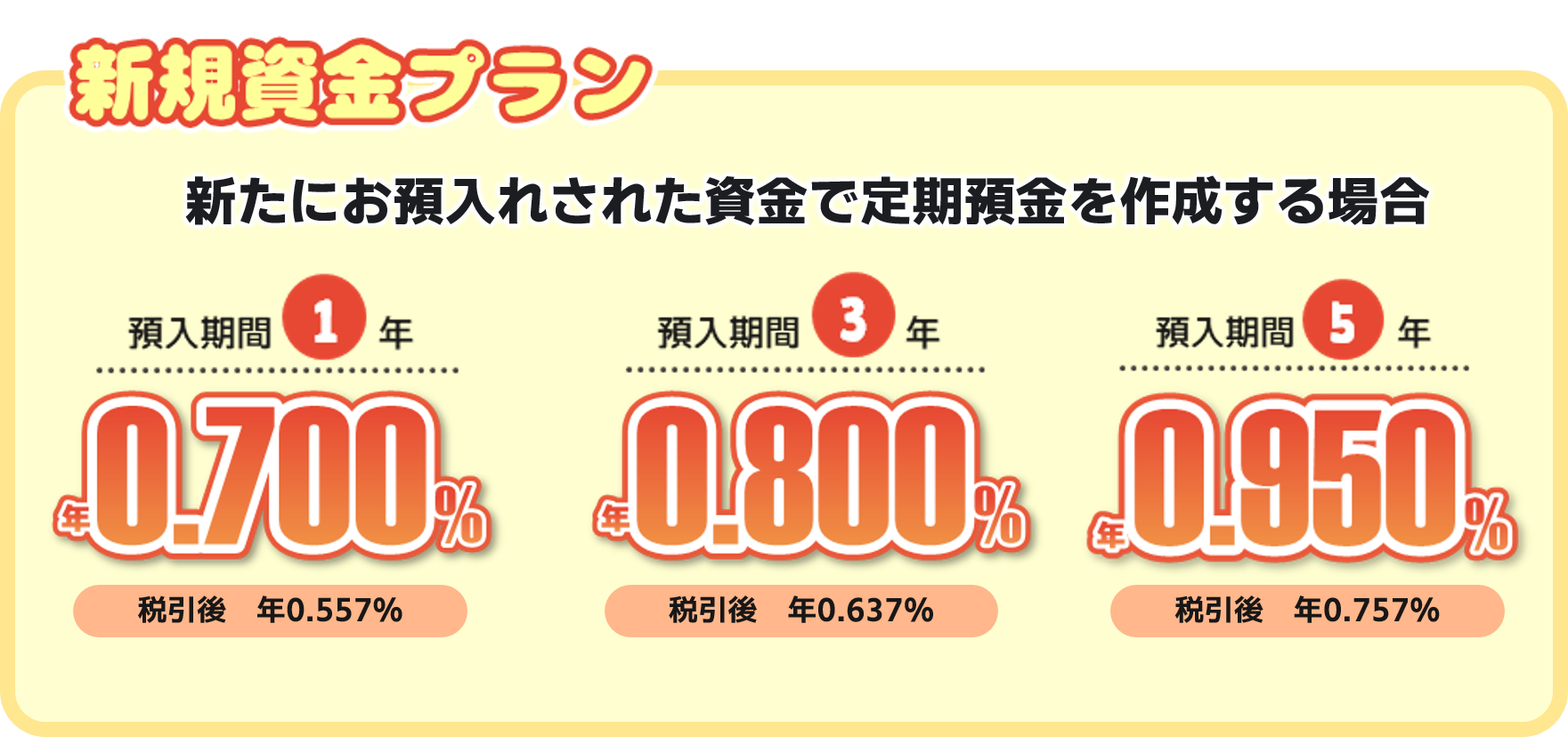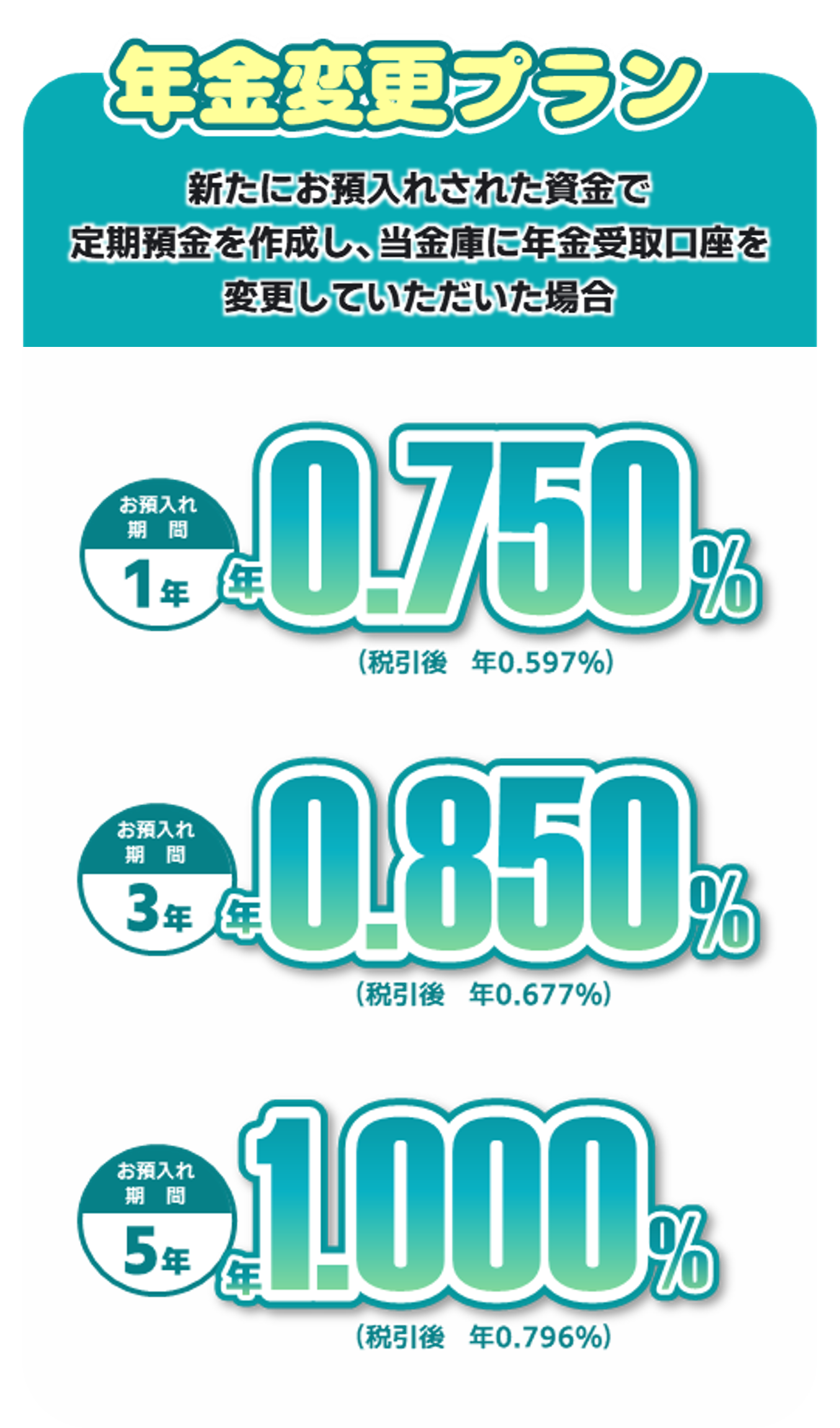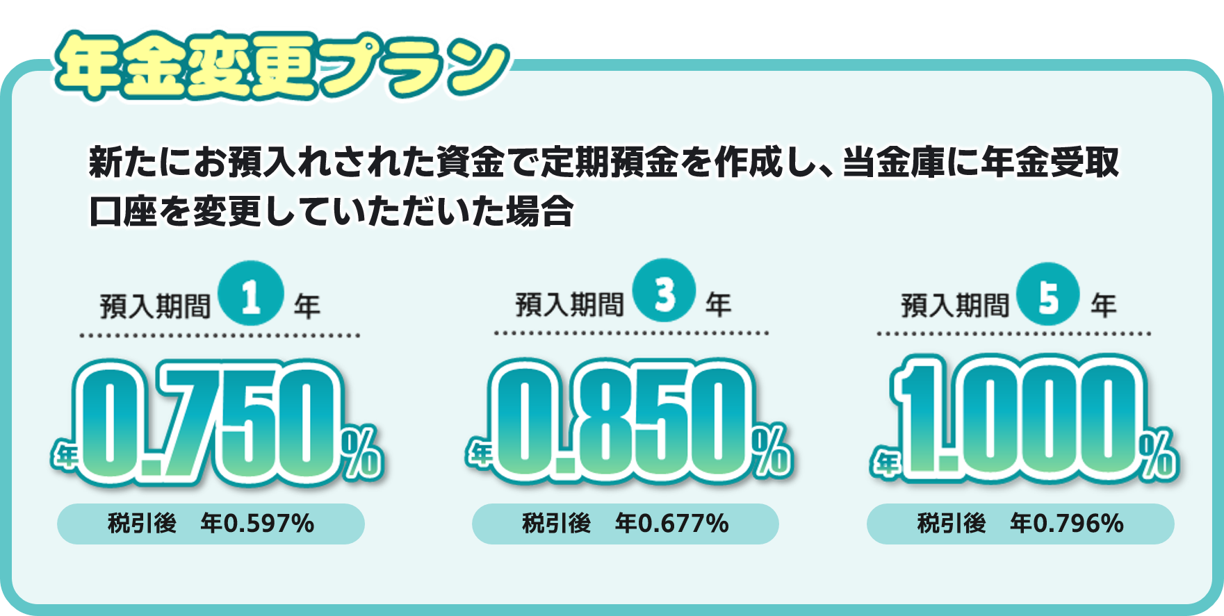| 利息 | (1)適用金利 契約日より当初満期日の前日まで、下記の金利(固定金利)を適用します。 【新規資金プラン】(新規預入資金) 期間1年 0.700%(税引後 年0.557%) 期間3年 0.800%(税引後 年0.637%) 期間5年 0.950%(税引後 年0.757%) 【年金変更プラン】(新規預入資金であることに加え、年金変更ご成約) 期間1年 0.750%(税引後 年0.597%) 期間3年 0.850%(税引後 年0.677%) 期間5年 1.000%(税引後 年0.796%) 【新規資金以外】(既存のスーパー定期預金に100千円以上の上乗せで取扱い可能) 期間1年 0.375%(税引後 年0.298%) (2)利払方法 満期日以後に一括して支払います。 (3)計算方法 期間1年:付利単位を1円とした1年を365日とする日割計算 期間3年、5年:付利単位を1円とした1年を365日とする日割計算で6ヵ月毎の複利計算 |