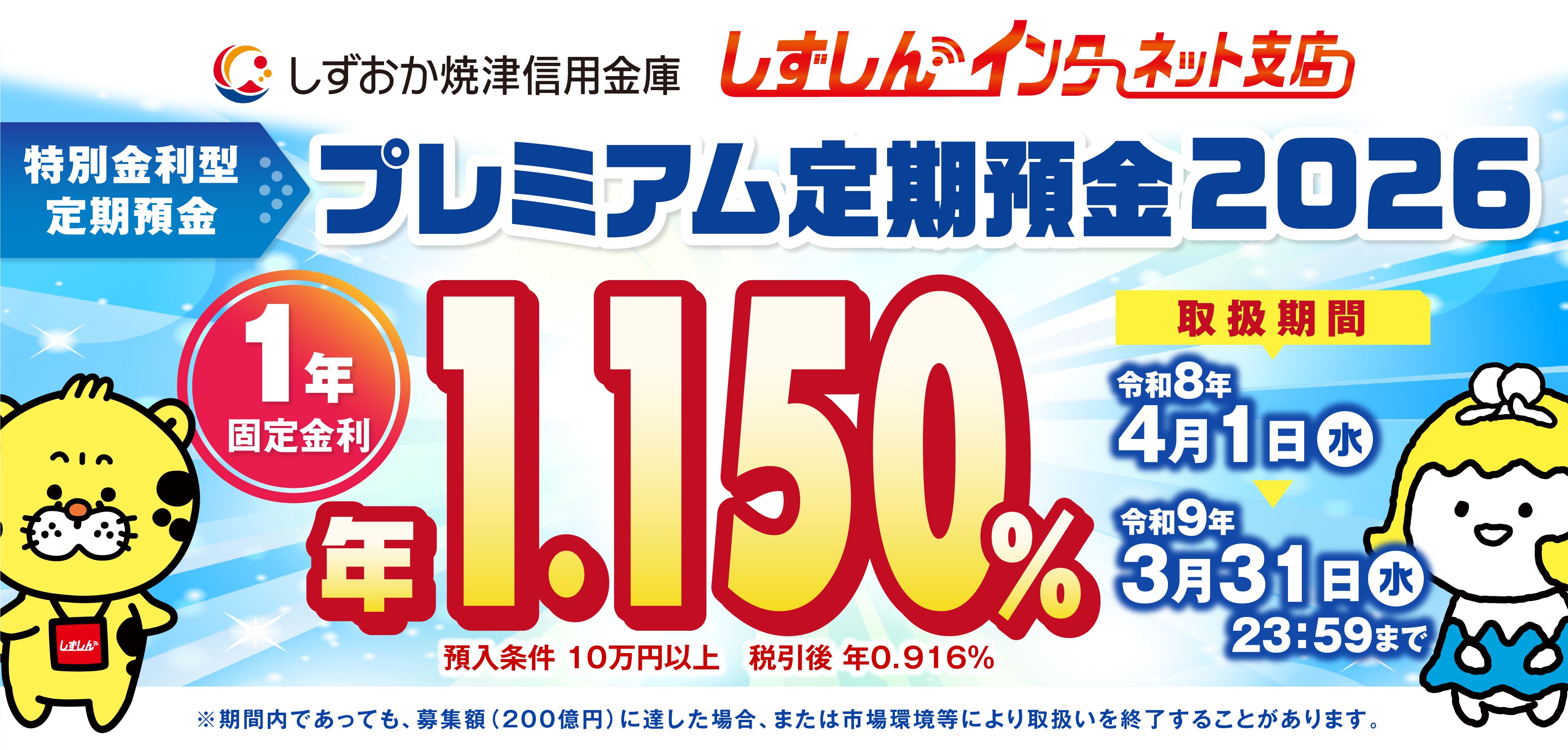 しずしんインターネット支店では、令和8年4月1日(水)から新たに特別金利型定期預金「プレミアム定期預金2026(1年)」を発売します。