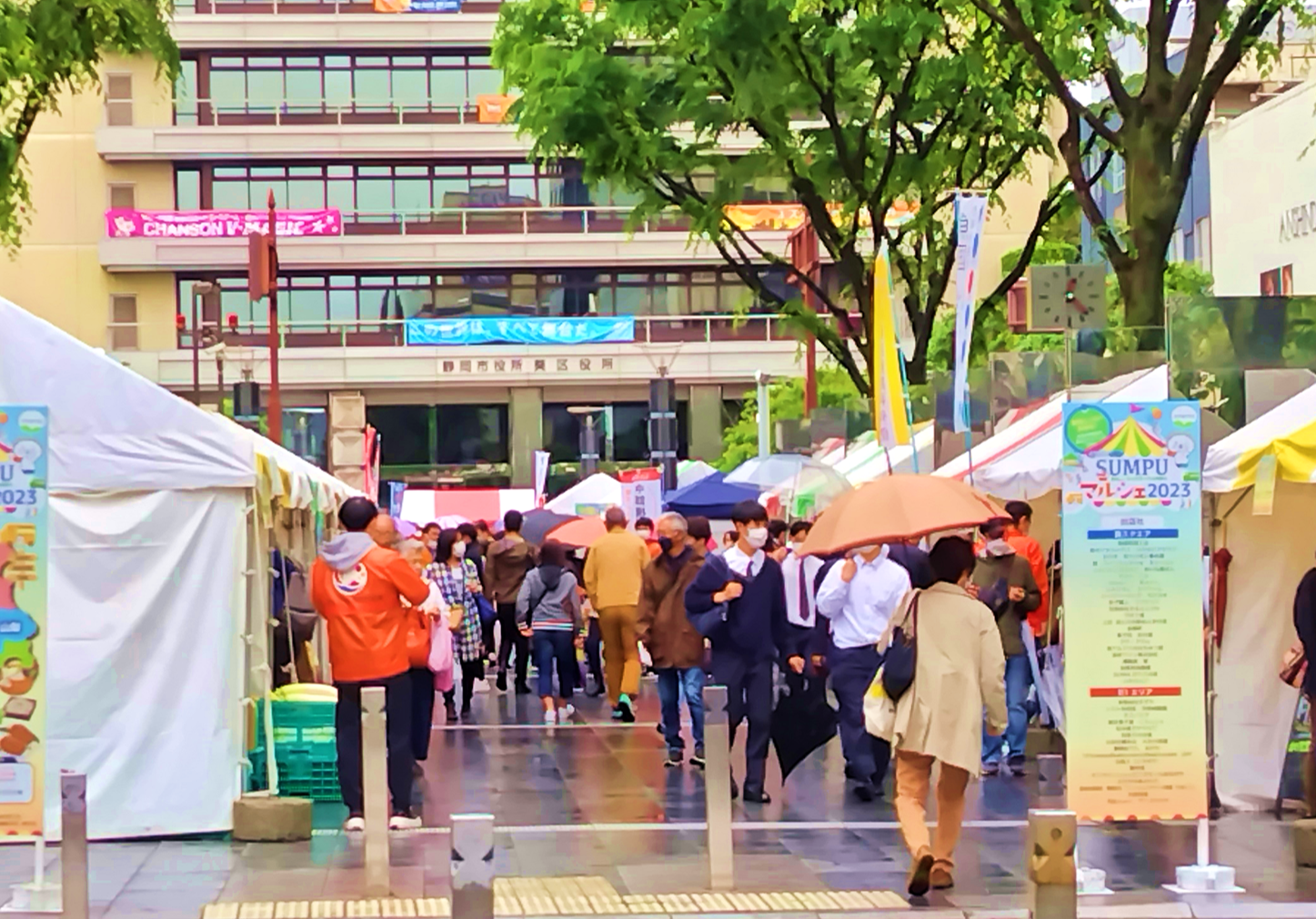 5月13日(土)、静岡市役所に隣接する「青葉イベント広場、青葉緑地」にて「第2回SUMPUマルシェ」総出店者数37店舗(うち静岡26店舗、山梨県8店舗、長野県3店舗)にて開催しました。当日は、スタート直後から終日雨降りとなる生憎な天候の中での開催となりましたが、悪天候にも関わらず昨年を上回る大勢のお客様にお越しいただきました。