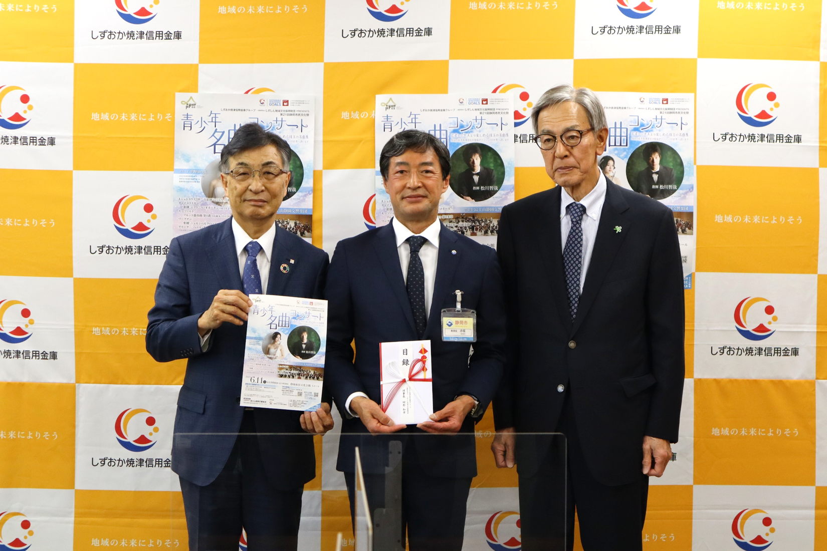 当金庫は、(一財)しずしん地域文化振興財団を含めたしずおか焼津信用金庫グループが一体となり、次代を担う世代への様々な教育に取り組んでいます。今般、静岡市部活動応援隊活動の一環として、(公財)富士山静岡交響楽団様のご協力を賜り、静岡市立(私立)中学校吹奏楽部部員に「青少年名曲コンサート」招待券400枚を贈呈し、目録贈呈式を4月19日(水)に行いました。