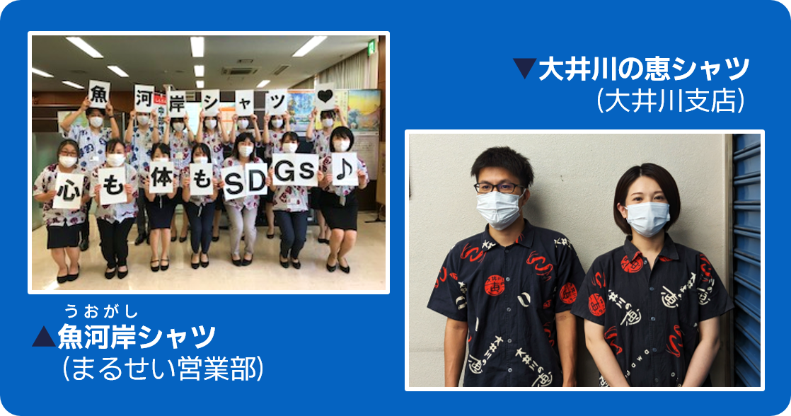 焼津を象徴する「魚河岸シャツ」と、大井川の特産であるサクラエビとシラスをデザインに取り入れた「大井川の恵シャツ」の着用により、地域金融機関として地域文化の発信と地域活性化に貢献していきます。