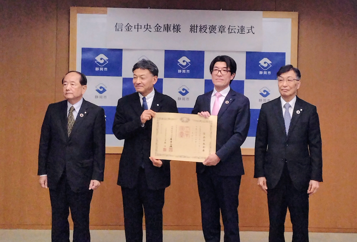 当金庫は令和3年度に、信金中央金庫【創立70周年記念事業】地方創生スキーム「SCBふるさと応援団」に静岡市を推薦し、それにより信金中央金庫から静岡市への寄附が行われました。静岡市への寄附の功績が認められ、昨年12月23日、信金中央金庫が紺綬褒章を受章する運びとなったため、4月22日(月)、静岡市・信金中央金庫及び推薦機関である当金庫と静清信用金庫による伝達式が執り行われました。