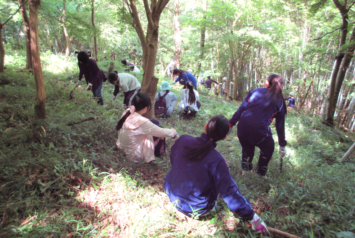 今回の活動では新入職員が活動参加者の大半を占め、はじめに「やつやま友の会」の方々に放任竹林についてのお話を聞き、環境保護の大切さを学んだうえで活動を行いました。