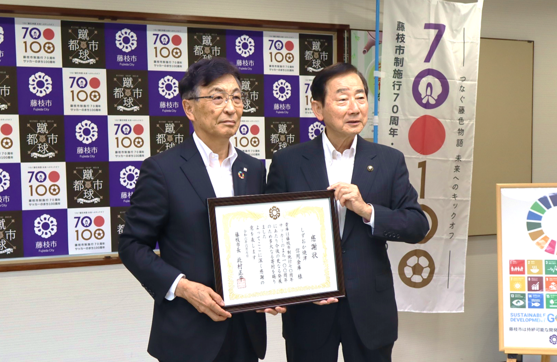 当金庫は「藤枝市制施行70周年およびサッカーのまち100周年記念事業」へ寄付を行いました。6月7日(金)、藤枝市役所にて寄贈式を執り行い、北村市長より感謝状をいただきました。