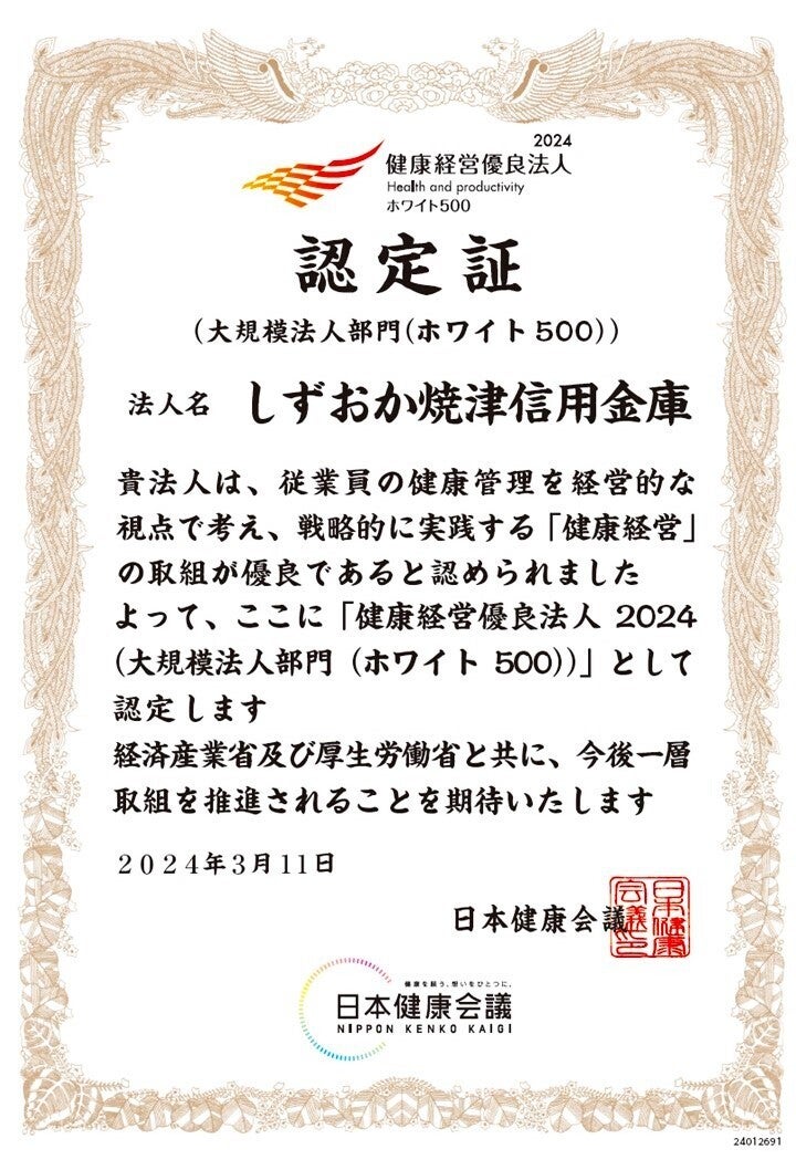 当金庫は「健康経営優良法人認定制度」において、「健康経営優良法人2024(大規模法人部門 ホワイト500)」の認定を受けました。