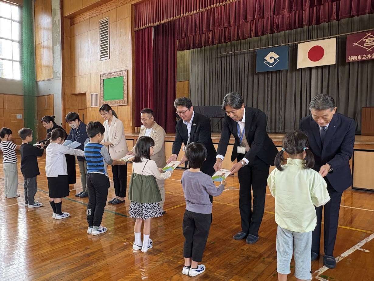 10月15日(水)、静岡市立井宮小学校にてSDGsシール絵本の贈呈式が行われ、当金庫を含む代表企業7社が参加しました。当日は、代表児童7人にSDGsシール絵本を手渡し、児童からは感謝の言葉をいただきました。 シール絵本は静岡市内の各小学校1年生に寄贈され、授業や家庭で楽しんでいただくために活用されます。