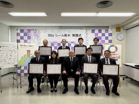 11月6日(木)、藤枝市役所にて「SDGsシール絵本寄贈式」が行われ、当金庫を含む代表企業8社が参加しました。当日は、藤枝市教育長へSDGsシール絵本を贈呈し、同教育長からは各企業へ感謝状が贈呈されました。 シール絵本は藤枝市内の各小学校1年生に寄贈され、授業や家庭で楽しんでいただくために活用されます。