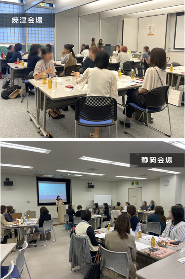 女性事業者様に、悩みの共有や新たなつながりの創出、経営のヒントを得られる機会を提供することを目的とした、「第7回女性事業者交流会~WOMAN WILL POWER~」を焼津会場・静岡会場の2会場にて開催し、両会場合わせて46名のご参加をいただきました。 10月17日(金)はしずおか焼津信用金庫 焼津本部にて開催し、ゲストスピーカーにイラストレーターのやまむらともよ様、10月30日(木)はアイセル21にて開催し、ゲストスピーカーにフリーアナウンサーの牧野光子様をお招きしました。自身の経験をもとにしたご講演をしていただき、仕事の広げ方や人とのつながりの大切さなどを参加者の方々にお話いただきました。 講演後は、女性事業者同士がグループトークを通して、事業内容や悩みを共有したり、アドバイスをし合ったりと、和やかかつ活気にあふれたパワフルな交流会となりました。