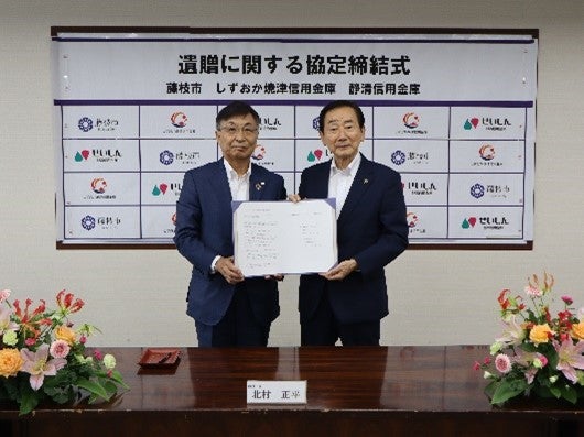 9月22日(月)、しずおか焼津信用金庫は藤枝市と「遺贈に関する協定」を締結いたしました。 本協定の締結を機に、当金庫と藤枝市はこれまで以上に緊密に連携し、地域の活性化や社会貢献に共働して取り組んでまいります。 締結式では、当金庫の田形理事長、藤枝市の北村市長が協定書に署名を行いました。 なお、協定式は当金庫、静清信用金庫、藤枝市の3者合同で開催いたしました。